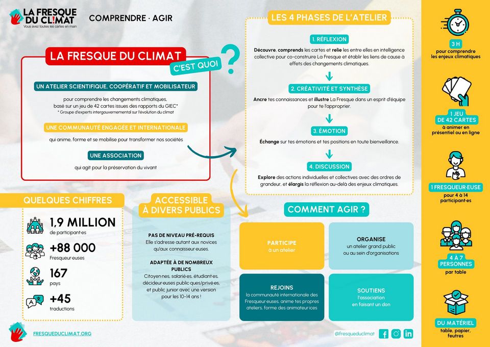 La Fresque du Climat est un atelier ludique et collaboratif qui permet de mieux comprendre les enjeux du changement climatique grâce à l’intelligence collective. En trois heures, vous allez explorer les causes et conséquences du dérèglement climatique et réfléchir ensemble aux solutions pour agir.