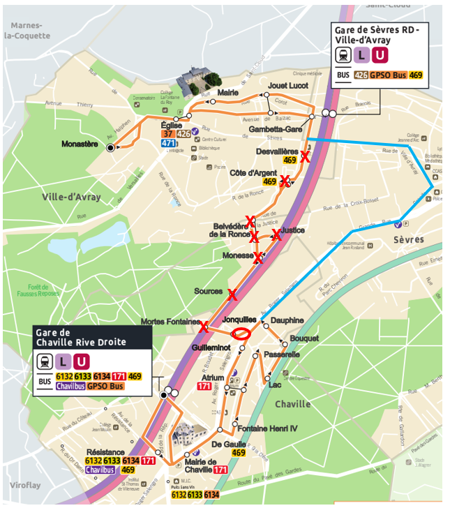 Travaux, Stationnement, Circulation, Transport Bus 469 : déviation du 17 au 21 novembre En raison de travaux dans la rue Guilleminot du 17 au 21 novembre 2025, le trajet du bus 469 sera dévié entre Chaville et Ville d'Avray. Mis en ligne le 14 novembre 2025 Bus 469 - Déviation - Arrêts non desservis (du 17 au 21 novembre) :JonquillesMortes FontainesSourcesMonesseJusticeBelvédère de la RonceCôte d'ArgentDesvallières Précédent Retour à la liste Suivant