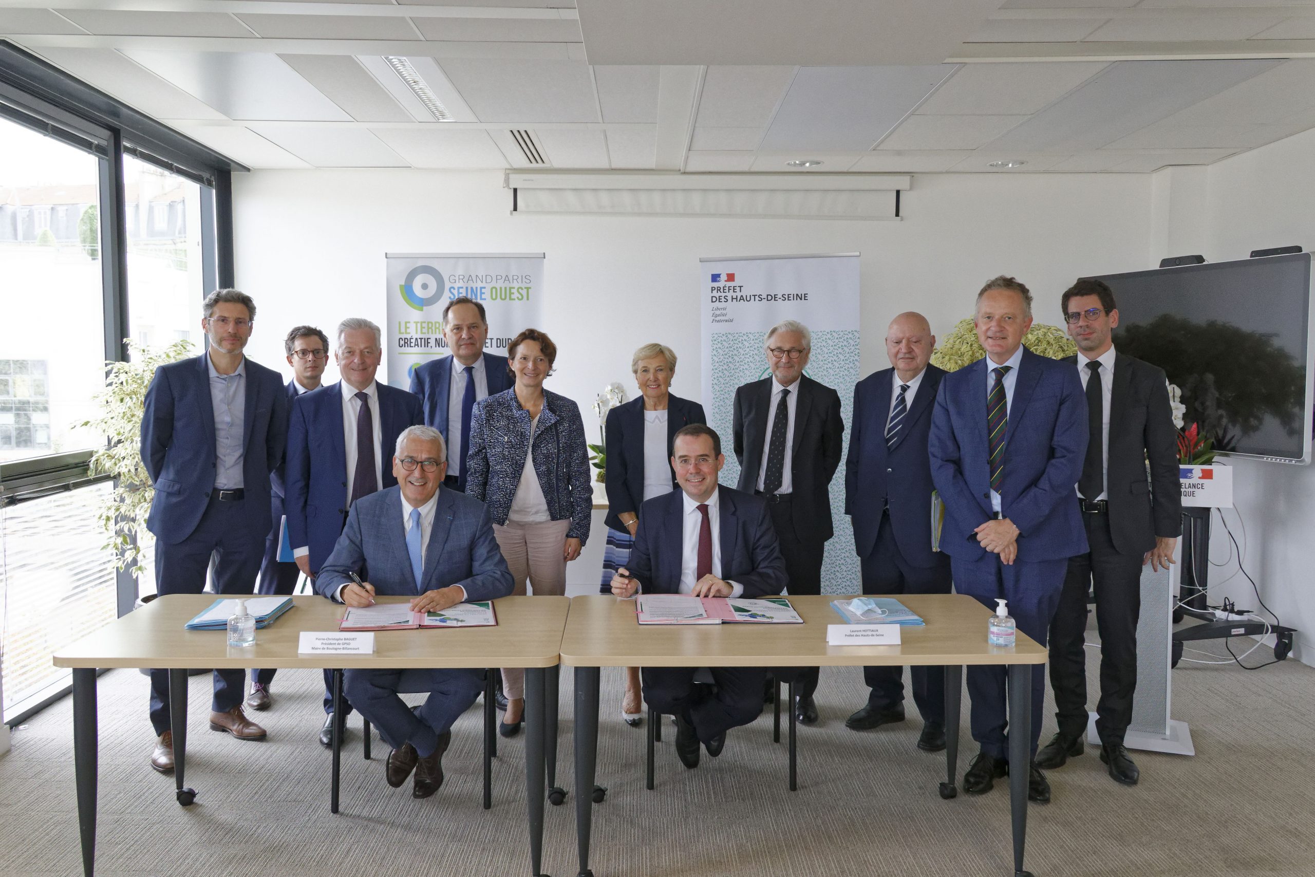 Pierre-Christophe Baguet, président de l’Établissement public territorial Grand Paris Seine Ouest et maire de Boulogne-Billancourt, accompagné des sept vice-présidents de GPSO, et Laurent Hottiaux, Préfet des Hauts-de-Seine, ont signé le 14 septembre 2021 un contrat de relance et de transition écologique (CRTE) en faveur d’une reprise économique sur le territoire de GPSO.