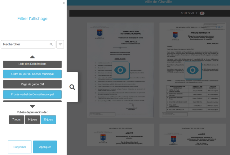- Faites une recherche manuelle ou sélectionnez le type d'actes souhaité (par ex. Procès-verbal du Conseil municipal)